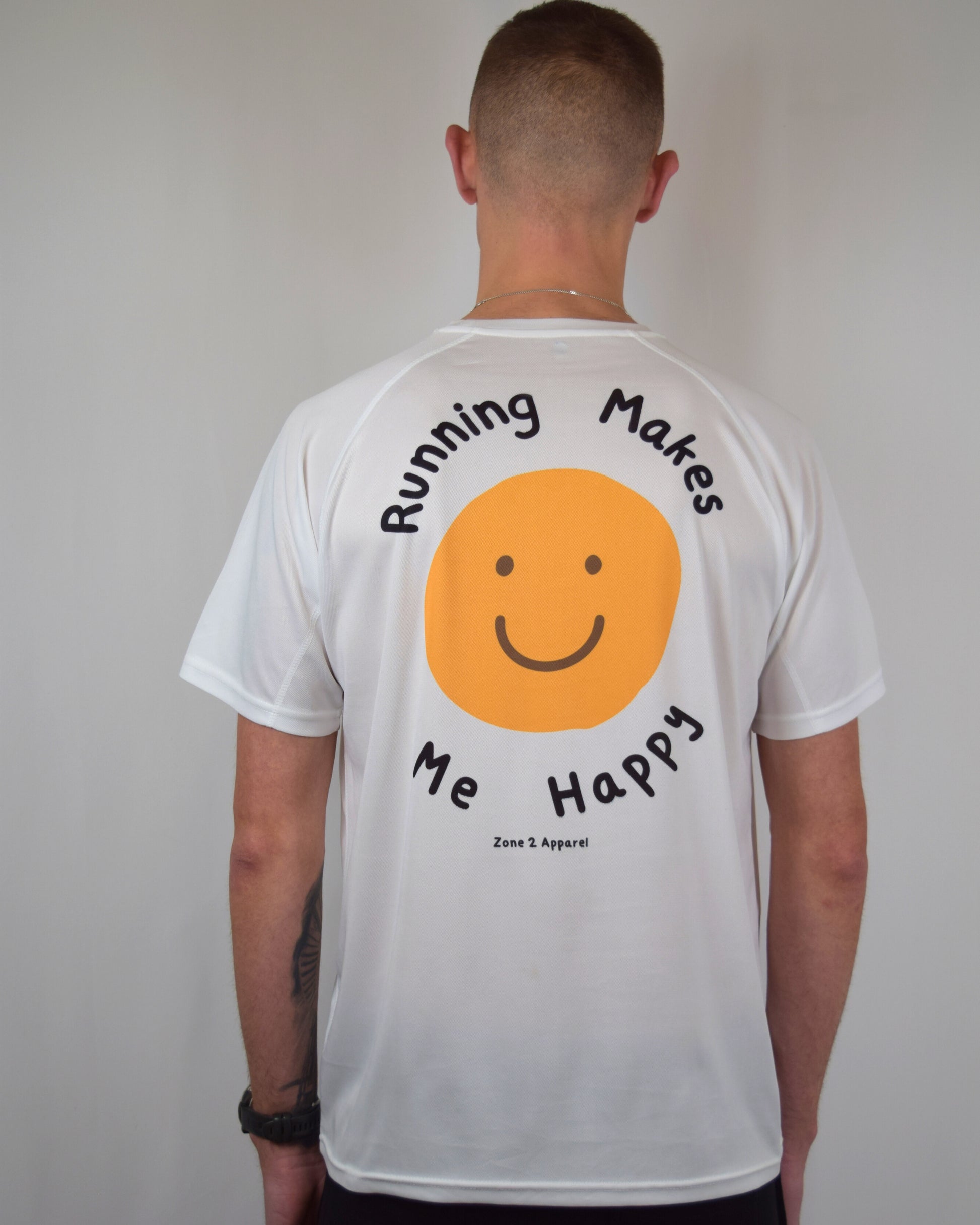 Featuring a bold “running makes me happy” graphic and smiley on the back, paired with a clean Z2 logo on the front, this tee is all about celebrating the joy of running.