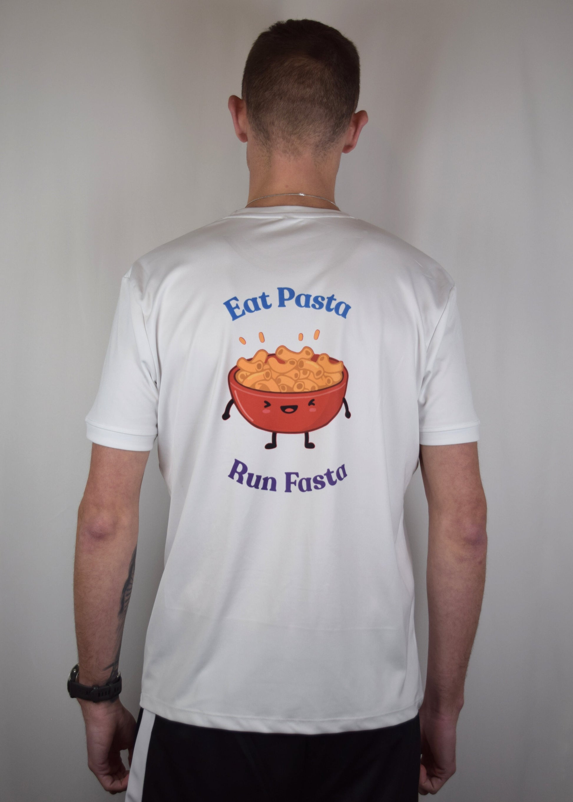 Fuel your runs the delicious way. The Pasta Tee takes our ultra light, air dry mesh performance fabric and pairs it with a playful back graphic featuring a very happy bowl of pasta reminding you of the real secret to speed: “Eat Pasta, Run Fasta.”